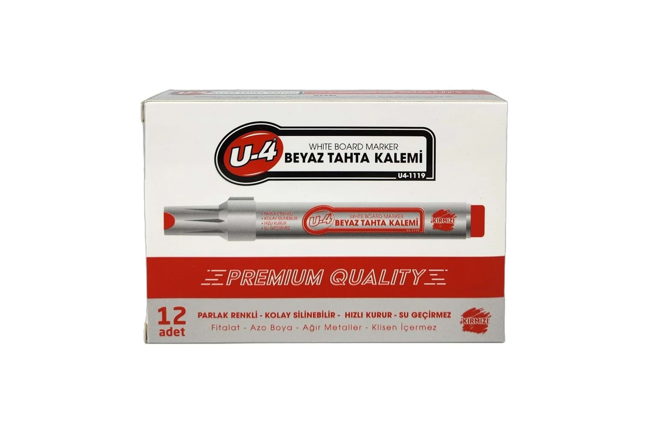 U-4 Premium tahta kalemi, beyaz tahta ve benzeri yüzeylerde net ve canlı yazım sağlamak için üretilmiştir. Akıcı mürekkep yapısı sayesinde rahat yazım sunar. Ofis, okul ve eğitim alanlarında kullanıma uygundur.